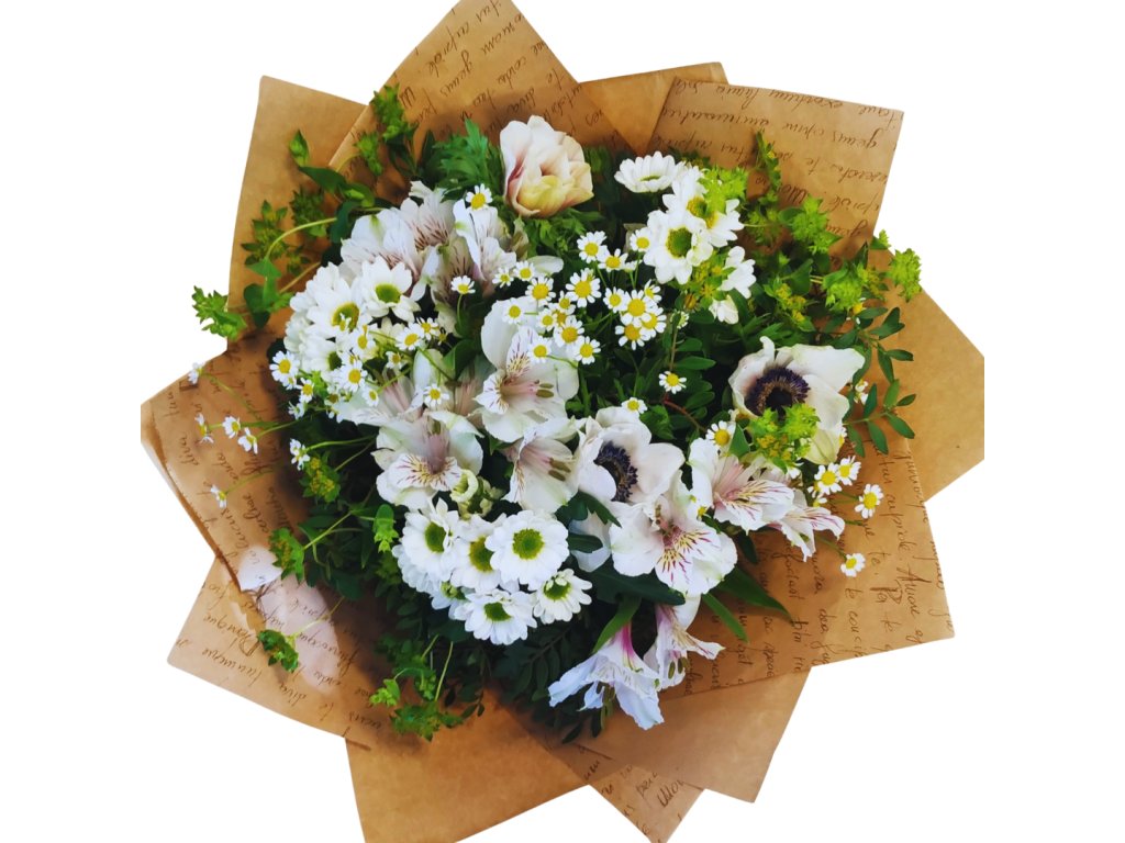 Kytice s dominantní bílou barvou. Fotografie je ilustrační, pracujeme vždy se sezónními a čerstvými květinami, skladba kytice se tedy může oproti obrázku lišit. Kytice však bude uvázána tak, aby hlavním barevným tónem byla bílá. Fotografie odpovídá střední velikosti.