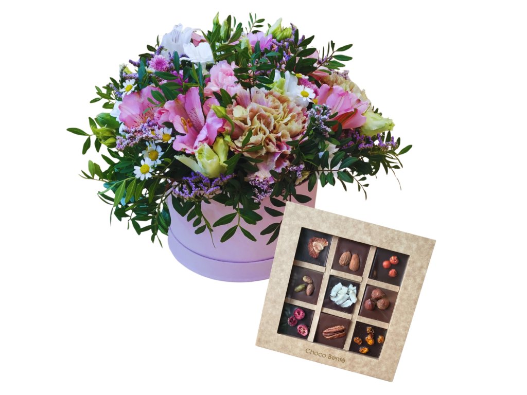 Dárková sada sestavená z flowerboxu a velké čokolády. Fotografie je ilustrační, pracujeme vždy se sezónními a čerstvými květinami, skladba květin v dekoraci se tedy může oproti obrázku lišit, papírová krabice včetně květin však bude vždy laděna do světlých barev. Čokoláda, která je součástí dárkové sady, je ručně vyráběná čokoláda prémiové kvality od české firmy Choco Bonté z Olomouce.