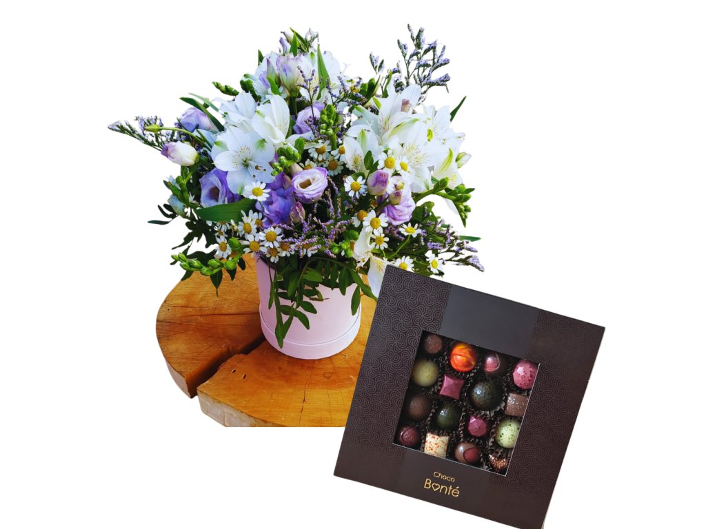 Dárková sada sestavená z flowerboxu a velké bonboniéry. Fotografie je ilustrační, pracujeme vždy se sezónními a čerstvými květinami, skladba květin v dekoraci se tedy může oproti obrázku lišit, papírová krabice včetně květin však bude vždy laděna do světlých barev. Bonboniéra, která je součástí dárkové sady, je naplněna ručně vyráběnými pralinkami prémiové kvality od české firmy Choco Bonté z Olomouce.