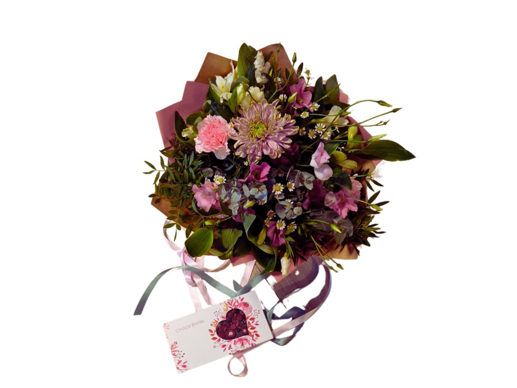 Střední kytice v jemných růžových tónech je vázaná z čerstvých sezónních květin a doplněná bohatou zelení. Působí přirozeně, radostně a elegantně. Spolu s kvalitní čokoládou Choco Bonte tvoří harmonickou kombinaci, která udělá radost k Valentýnu, narozeninám nebo jen tak – z lásky.