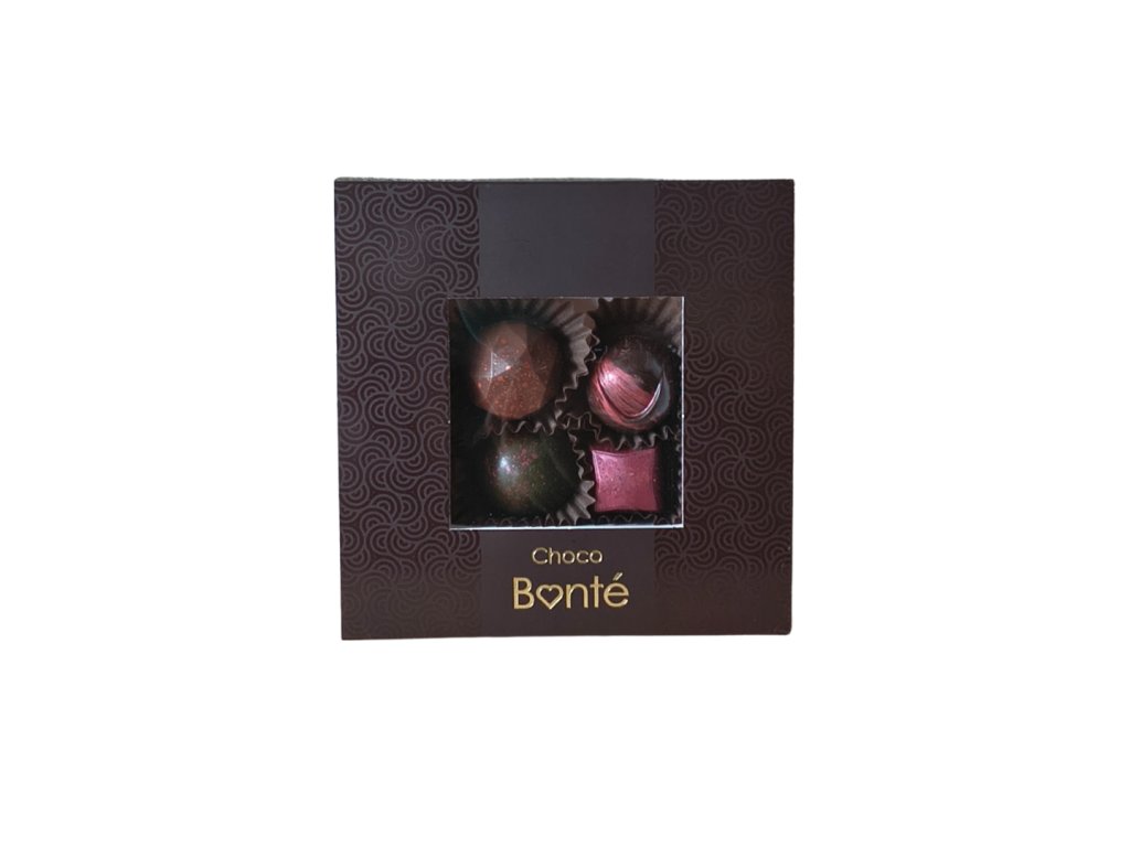 Malá degustační sada čtyř kusů pralinek. Pralinky jsou ručně vyráběné v prémiové kvalitě od české firmy Choco Bonté z Olomouce.