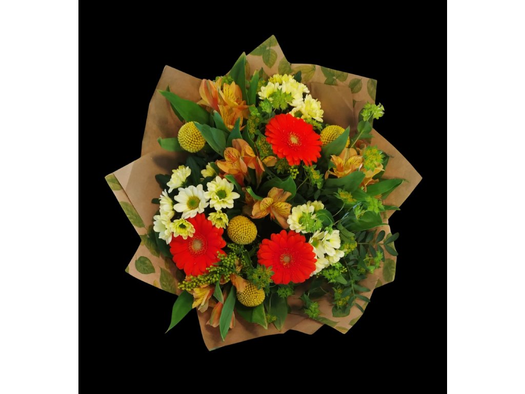 Kytice s dominantní oranžovou barvou. Fotografie je ilustrační, pracujeme vždy se sezónními a čerstvými květinami, skladba kytice se tedy může oproti obrázku lišit. Kytice však bude uvázána tak, aby hlavním barevným tónem byla oranžová. Fotografie odpovídá střední velikosti.