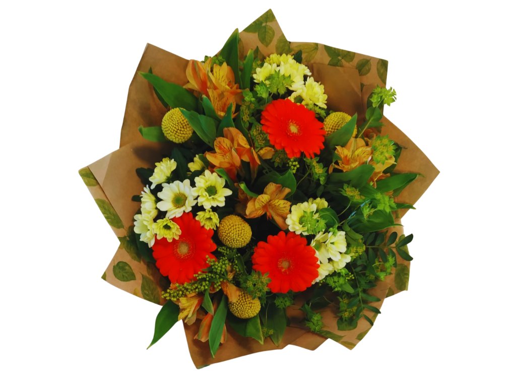 Kytice s dominantní oranžovou barvou. Fotografie je ilustrační, pracujeme vždy se sezónními a čerstvými květinami, skladba kytice se tedy může oproti obrázku lišit. Kytice však bude uvázána tak, aby hlavním barevným tónem byla oranžová. Fotografie odpovídá střední velikosti.