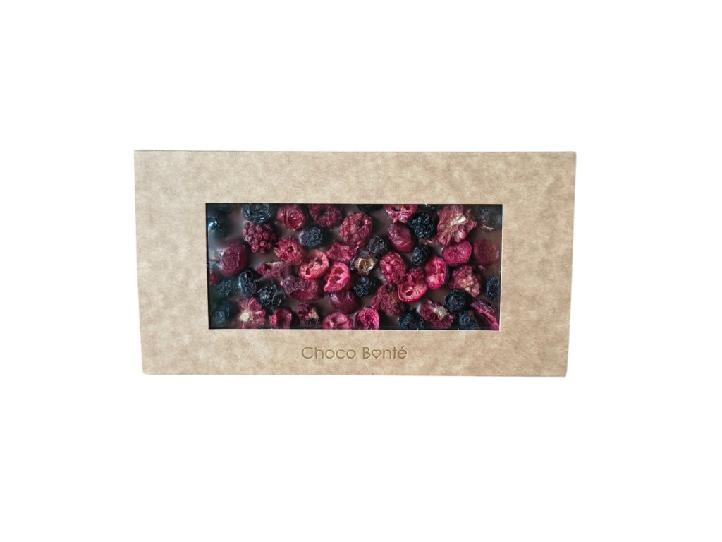 Mléčná čokoláda s lesními plody (maliny, ostružiny, borůvky, brusinky nebo jahody). Čokoláda je ručně vyráběná v prémiové kvalitě od české firmy Choco Bonté z Olomouce.