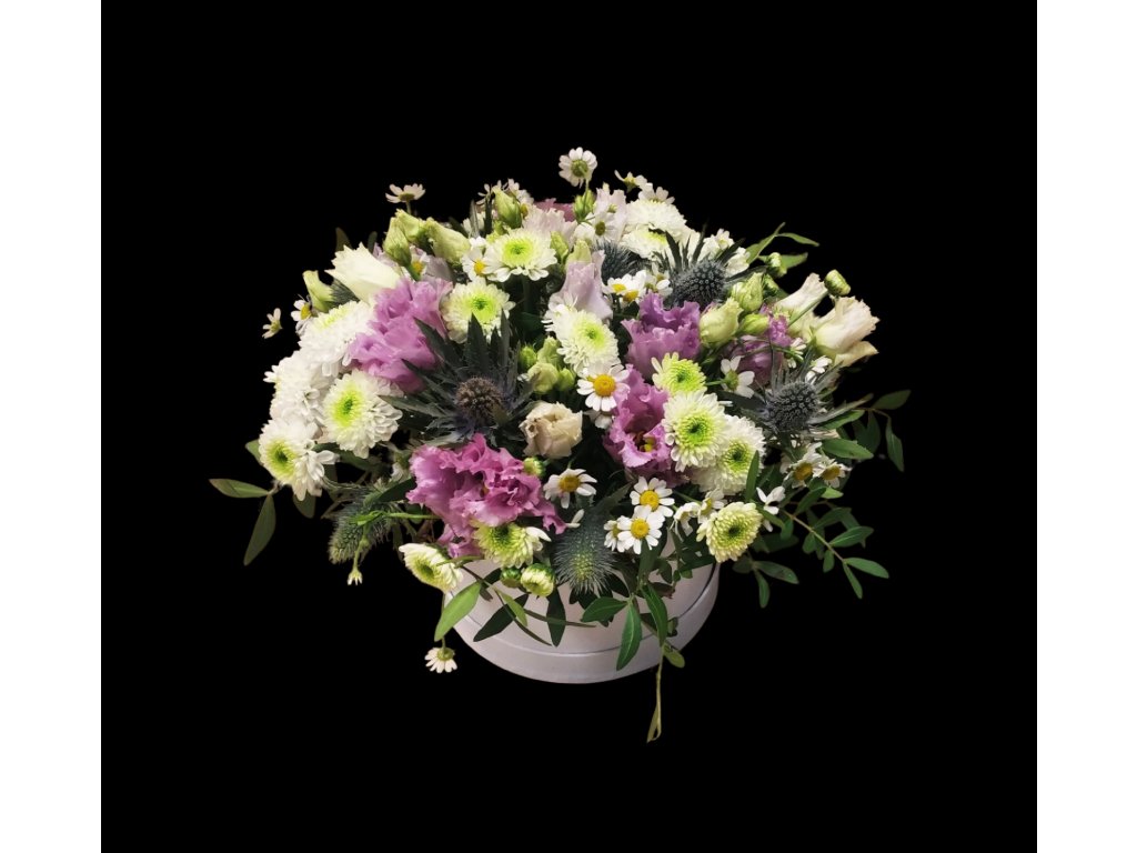 Květinová dekorace připravená z živých květin a zeleně ve světlé papírové krabici. Fotografie je ilustrační, pracujeme vždy se sezónními a čerstvými květinami, skladba flower boxu se tedy může oproti obrázku lišit. Květinová dekorace však bude vždy ve světlé papírové krabici a květiny budou laděny do růžových nebo fialových tónů.