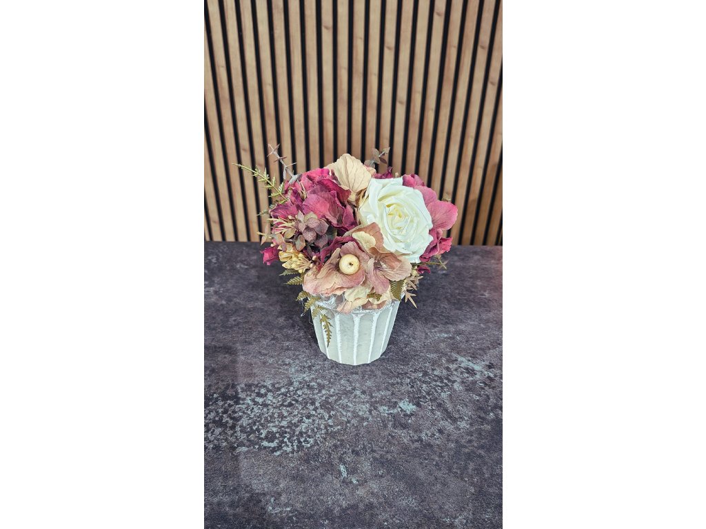 Podzimní trvalá dekorace v betonovém květináči s kombinací vínových, béžových a krémových květů. Dominantou aranžmá je krémová růže doplněná sušenými a umělými květy v podzimních odstínech.