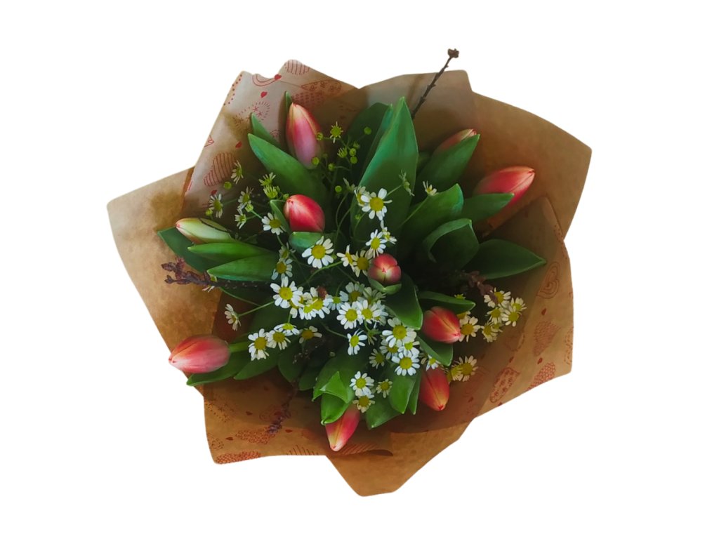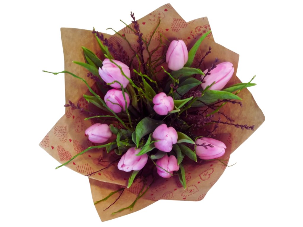 Kytice desíti tulipánů se zelení a přízdobou v papírovém kornoutu. Fotografie je ilustrační, barva tulipánů se liší podle aktuálních skladových zásob.